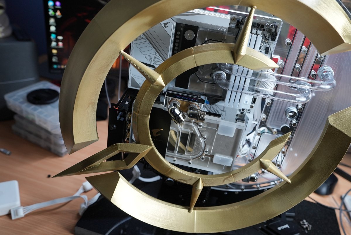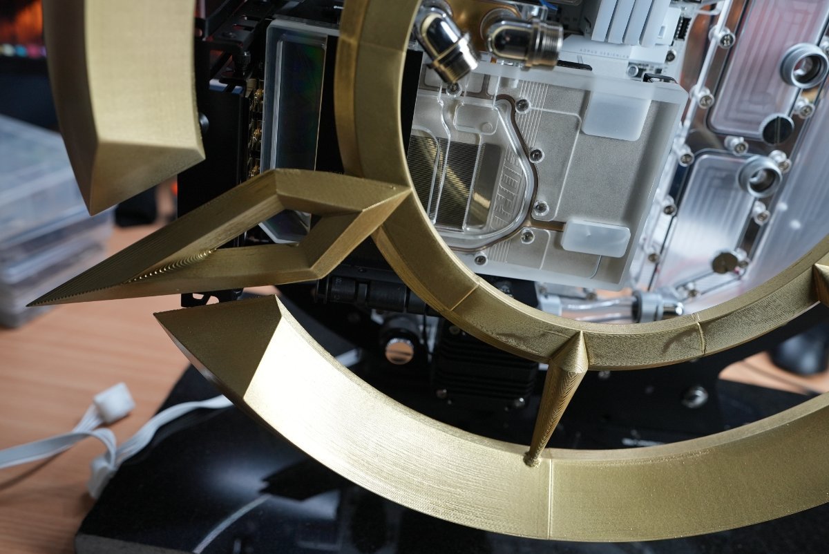 This is an extremely difficult build with a very intricate water cooling system and a details case mod which we had to 3D model, print, assemble, sand, prime, paint 3 coats on and mount.