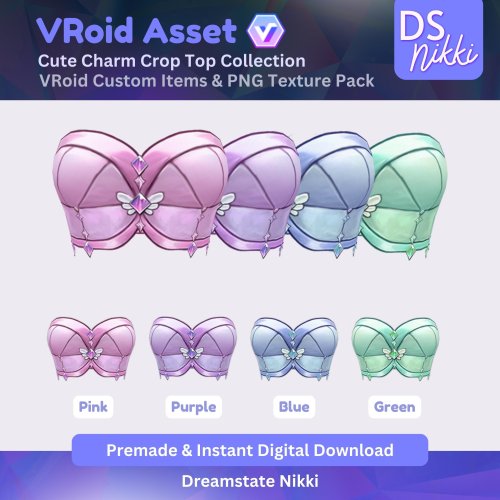 ✅ VRoid Custom Items – Cute Charm Crop Top Collection (4 colors: pink, blue, purple & green)
