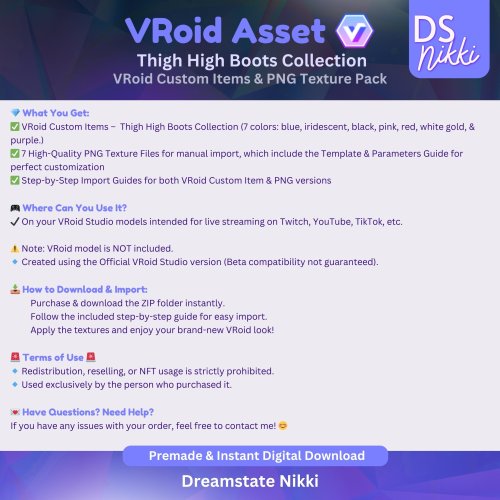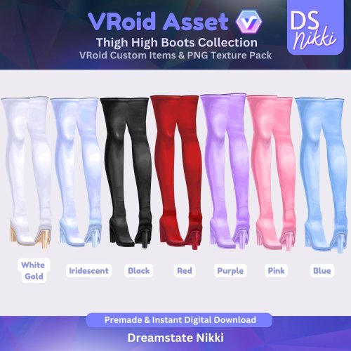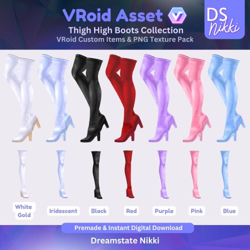 ✅ VRoid Custom Items – Thigh High Boots Collection (7 colors: blue, iridescent, black, pink, red, white gold, & purple.)